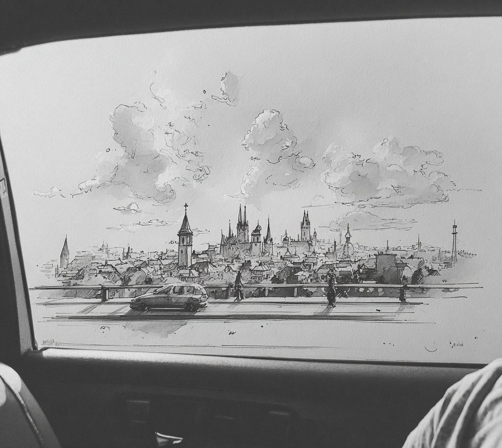 They finally make their way to outside the station. Professor Kovačević clutches his briefcase tightly against his chest the entire time with a white-knuckle death grip and Marie scans the taxi cab stand and other queued cars for their ride.
